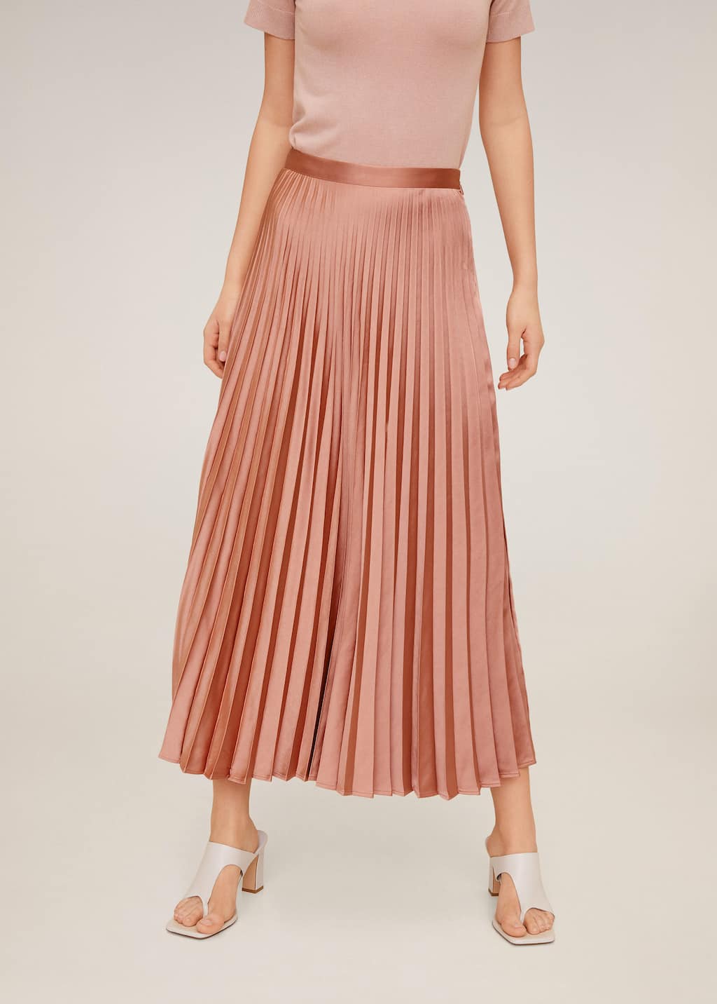 A minha última sugestão para a passagem de ano é mais elegante do que festiva: conjugar aquela linda camisola branca que já sugeri para o Natal com umas calças de tecido cor camel ou então com uma saia plissada, como a que está na imagem e que tem uma cor coral deliciosa! Para manter o estilo elegante, podem também acrescentar os stilletos – que também já sugeri… nota-se muito que gosto deles? – ao look.