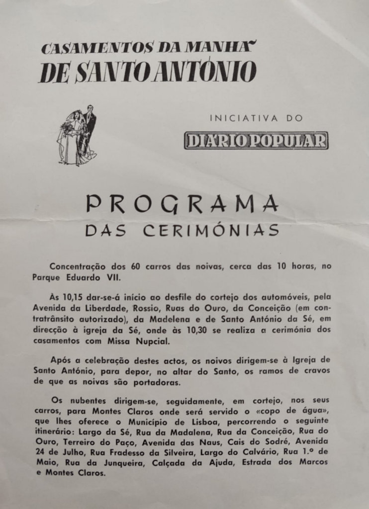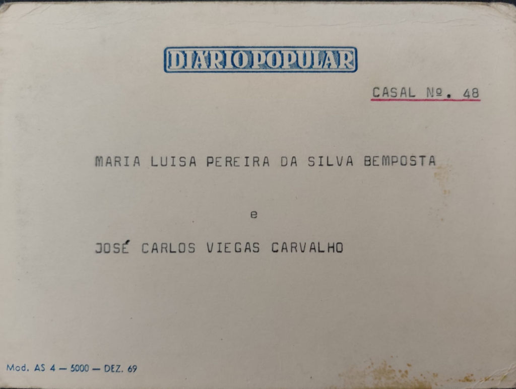 O meu marido na altura trabalhava na papelaria Fernandes, onde atendia muitos clientes, e um deles pertencia ao Diário Popular e perguntou-lhe se pensava em casar. Ele respondeu: “sim, mas por enquanto a verba que temos ainda não dá”. Depois disso, o cliente disse-lhe para não se preocupar e, passados uns dias, o senhor voltou com os papeis para nos inscrevermos nos casamentos de Santo António.