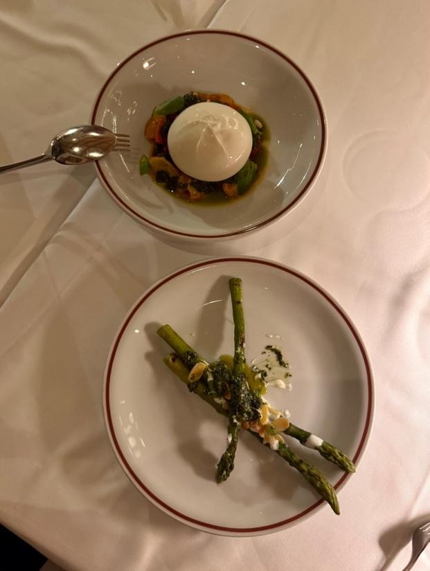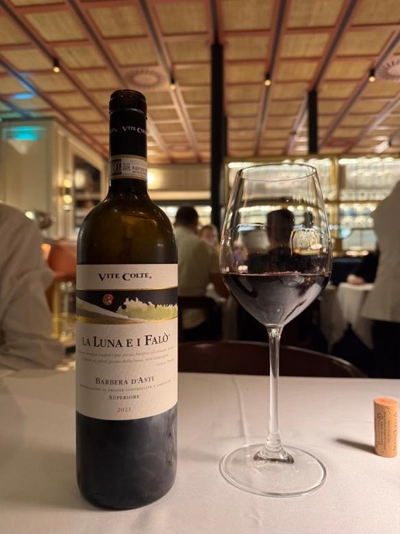 As primeiras impressões chegam sob a forma de azeitonas grandes e verdes, carnudas e bem temperadas, acompanhadas por generosos pedaços de parmesão com um sabor intenso e uma textura perfeita. Um começo simples, mas que anuncia qualidade. É também neste momento que percebemos que a casa leva o vinho a sério: o serviço é feito com rigor, a garrafa aberta com elegância e o ritual de cheirar a rolha de forma a entender o ponto do vinho cumpre-se com discrição e profissionalismo. Apesar de monocasta – como é normal nos vinhos italianos – este é um sabor com muito para apreciar: “La Luna e i Falò” (48€), um Barbera D´Asti Superiore de 2021. Tradicional tinto piemontês, intenso e de cor rubi, com aromas a violeta, alcaçuz e baunilha, quando na boca tanto é seco como macio e incorporado, com um toque final de frutos silvestres e carvalho francês: é a combinação perfeita para acompanhar os pratos escolhidos.